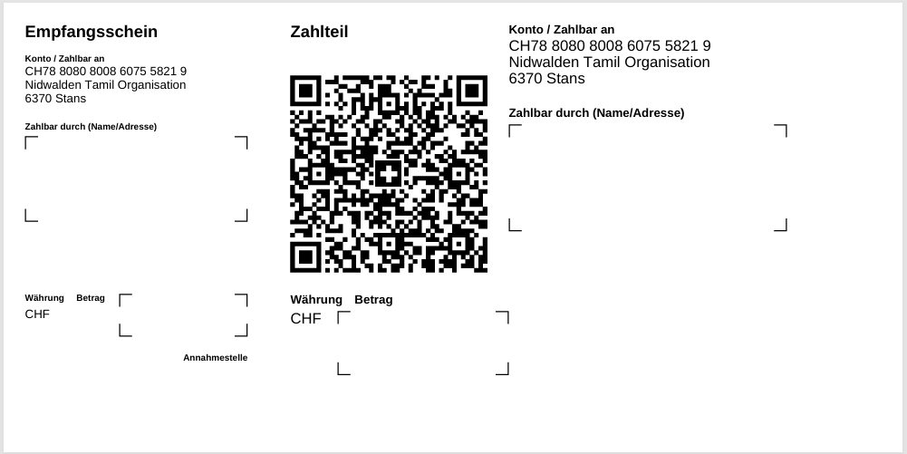 வருடாந்த ஆலய பூசைக் கட்டணத்தை TWINT மூலம் செலுத்துவதற்கு இந்த QR-Invoice ஐ தேர்வு செய்து 2.5% பரிவர்த்தனை கட்டணத்தை நீங்கள் சேர்த்து செலுத்த வேண்டும்.